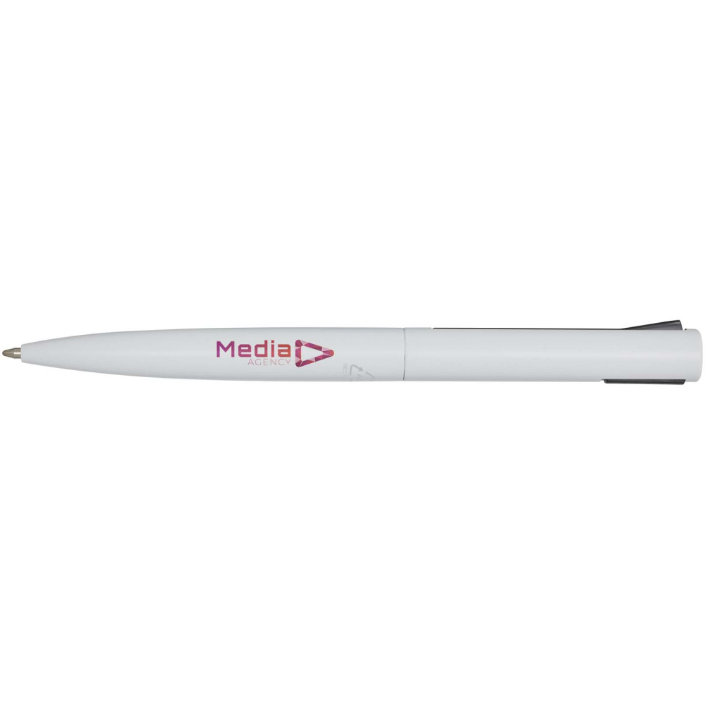 Kish kuglepen med sølvfinish (sort refill) Kish kuglepennen med sølvfinish har cylinder fremstillet af genvundet aluminium med touch stylus fremstillet af silikone. Genvundet aluminium sænker også mængden af affald på lossepladser og bidrager til at bevare naturressourcer med henblik på at sænke udledningerne af drivhusgasser. Blækfarve: Sort Skrivelængde: 800 meter. Spidsstørrelse: 1,0 mm.