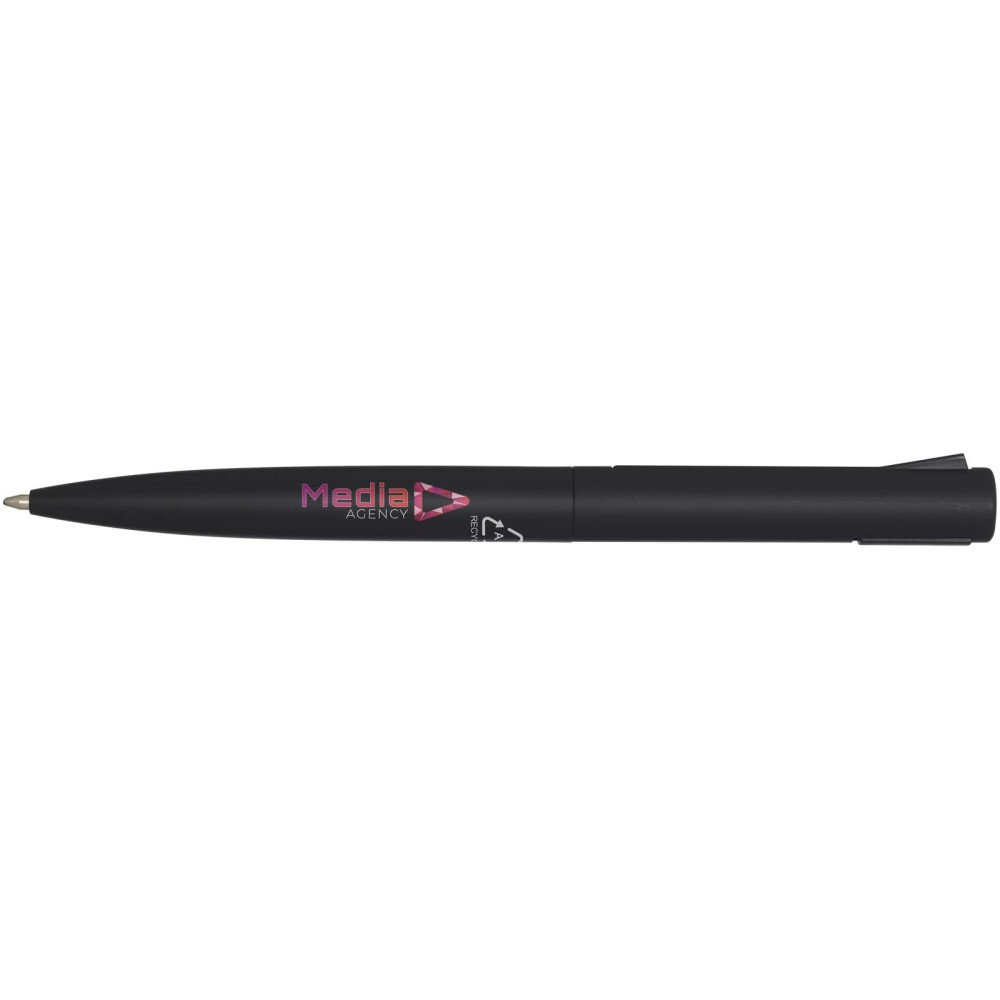 Ipe RCS genvundet kuglepen (sort blæk) Ipe kuglepennen har et minimalistisk design, der kun består af fire dele: cylinder, klips, fjeder og refill – hvilket gør den let og nem at bruge. Lavet af RCS certificeret genvundet plast, hvilket reducerer behovet for helt nye materialer. Blækfarve: Sort Skrivelængde: 800 meter. Spidsstørrelse: 1,0 mm.