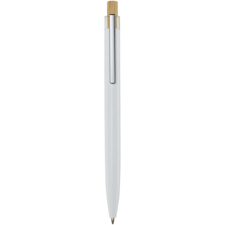 Nooshin kuglepen af genvundet aluminium (blå refill) Nooshin kuglepennen er lavet af genvundet aluminium, som kræver mindre energi end at producere aluminium fra råmaterialer. Det reducerer også mængden af affald på lossepladserne og bidrager til at bevare naturressourcerne med henblik på at reducere drivhusgasemissionerne. Trykknappen er fremstillet af bambus. Blækfarve: Blå. Skrivelængde: 800 meter. Spidsstørrelse: 1,00 mm.