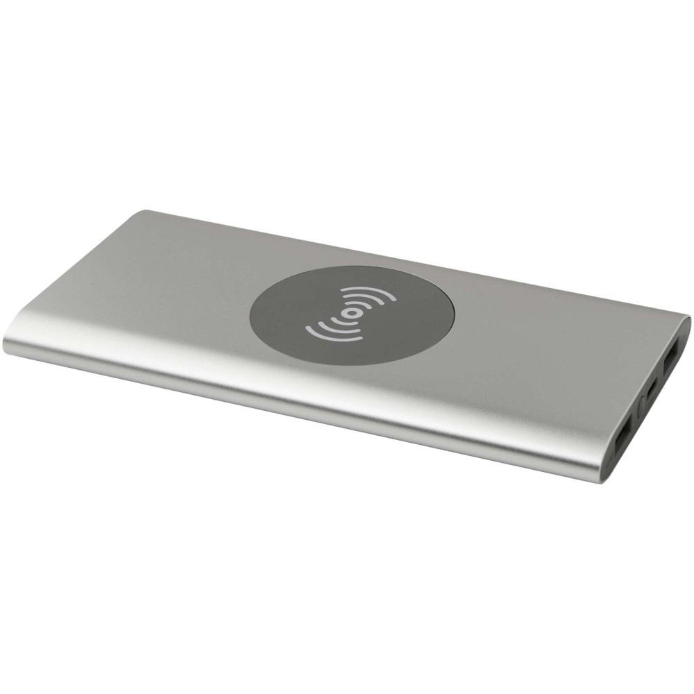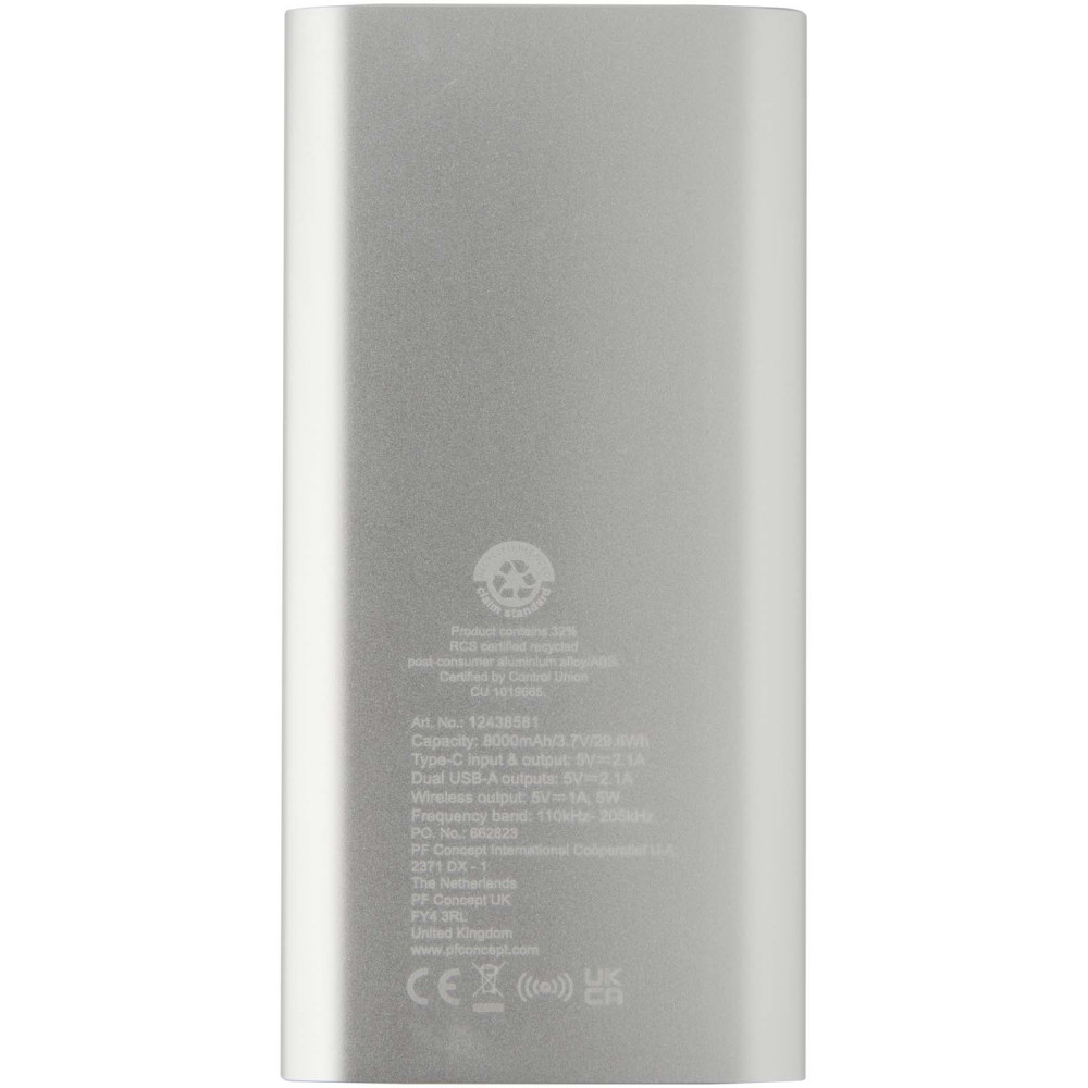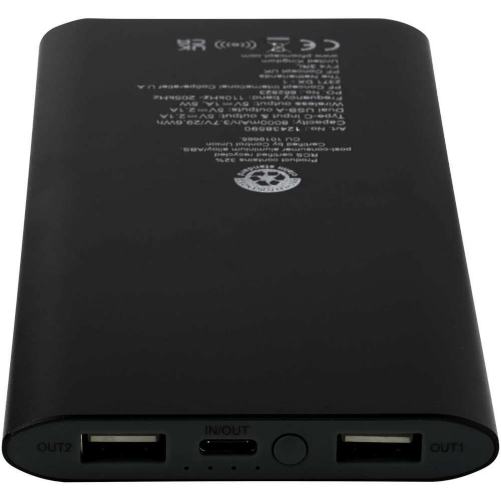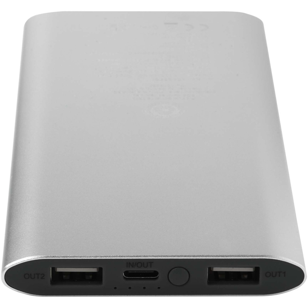 Juice 8000 mAh Type-C trådløs powerbank i genvundet aluminium Kontakt os for pris Firmalogo kan tilføjes på dette produkt Powerbank med Type-C ind/udgangsport og 2x USB-A-porte, hvilket betyder at tre enheder kan oplades samtidigt. Den understøtter også 5 W trådløs opladning til alle enheder med Qi aktiveret. Powerbanken har litium polymer batteri på 8000 mAh, som leverer en samlet udgangseffekt på max. 10 W. Powerbanken er lavet af 28 % RCS certificeret genvundet plast. Leveres med et TPE Type-C til USB-A opladningskabel. Farver Rød Kongeblå Sølv Ensfarvet sort Søger du reklameartikler og profiltøj? Kontakt vores team i dag, og lad os hjælpe dig med den rigtige løsning til din virksomhed 70 260 760 Kontakt os 70 260 760 Kontakt os