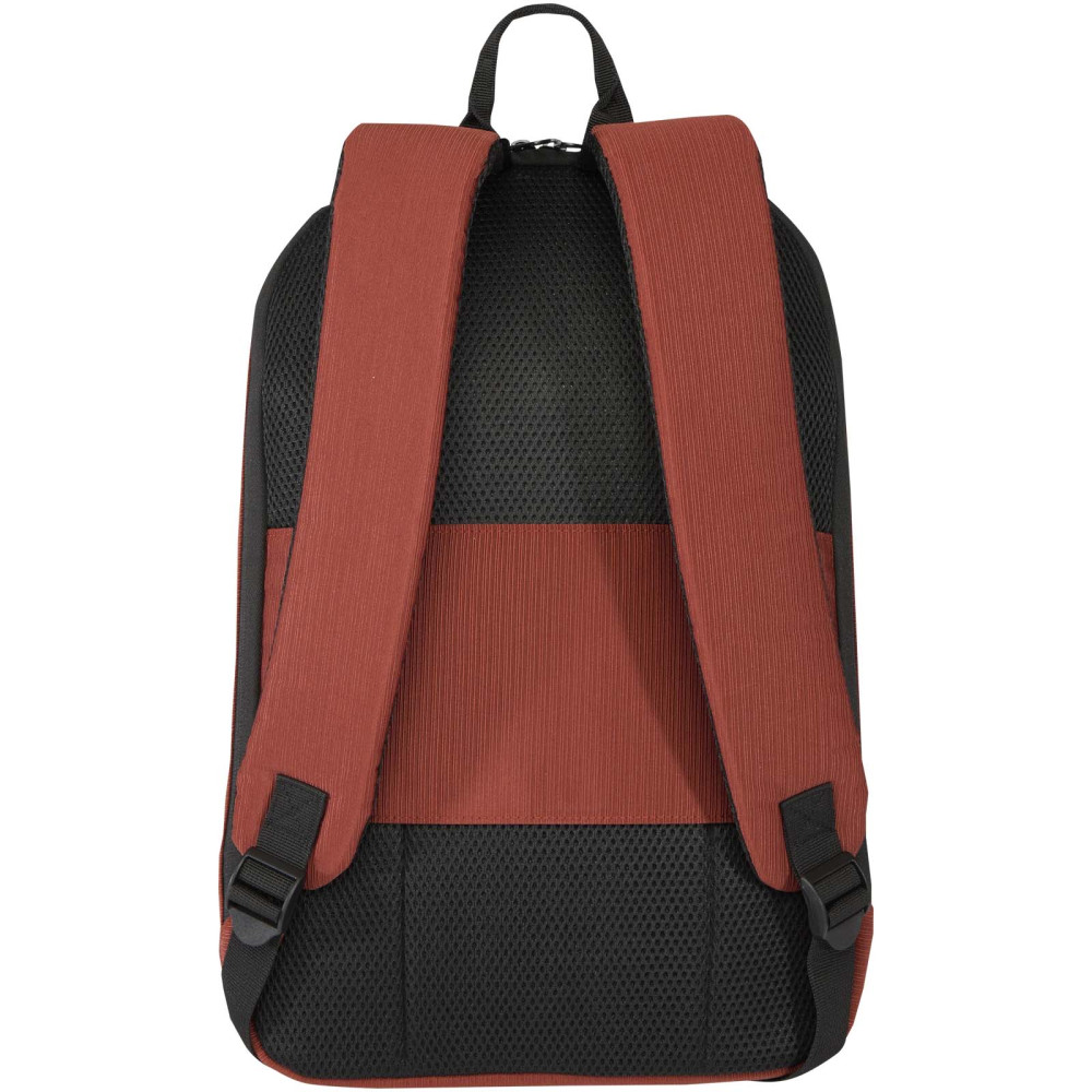 Luma 15 tommers tyverisikker laptoprygsæk GRS genvundet 10 l Kontakt os for pris Firmalogo kan tilføjes på dette produkt Fremstillet af genvundet jacquard polyester med for af RPET i matchende farve forener denne tyverisikre 15″ Luma rygsæk smart sikkerhed og elegant stil til folk på farten. Tyverisikringsfunktionerne omfatter låsbare lynlåse (lås medfølger ikke) og en skjult baglomme, der også fungerer som strop til kuffert. Stoffet er også vandafvisende for at beskytte dine ejendele mod let regn. Indeni finder du et polstret rum til computere til enheder på op til 15″, en særskilt lomme til en tablet, en åben indstikslomme med en løkke til en kuglepen og plads til organiseret opbevaring, så du kan holde dine vigtige ejendele pænt på plads. Designet har også polstrede skulderstropper, et åndbart bagpanel og metalplader på forsiden. Uanset om du cykler til arbejde, går gennem en travl lufthavn eller er på vej til undervisning, byder Luma rygsækken på stilfuld komfort hele dagen. Farver Mursten Marineblå Ensfarvet sort Søger du reklameartikler og profiltøj? Kontakt vores team i dag, og lad os hjælpe dig med den rigtige løsning til din virksomhed 70 260 760 Kontakt os 70 260 760 Kontakt os