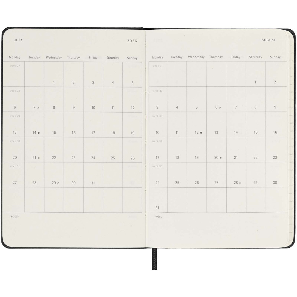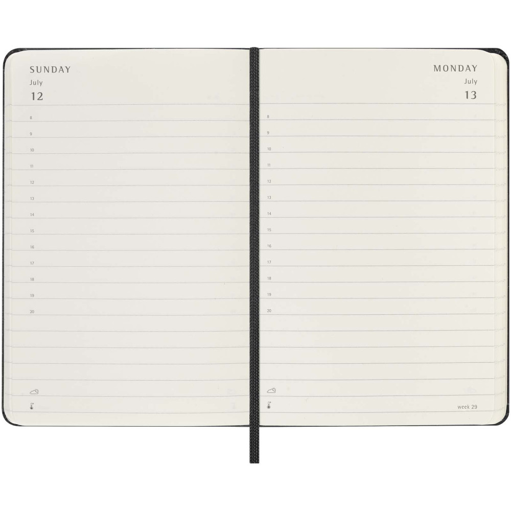 Moleskine hard cover 12 måneders daglig lommekalender Kontakt os for pris Firmalogo kan tilføjes på dette produkt Planlæg hver dag i mindste detalje med Moleskine 12-måneders dagskalender med hardcover. Denne kalender i lommestørrelse går fra januar til december 2027 og er formateret til at vise en hel dag pr. side – så der er masser af plads til at notere begivenheder, aftaler, gøremål, huskelister og planer. I løbet af året vokser den til at blive en dag-for-dag fysisk registrering af alt, der er opnået. Har elfenbensfarvet syrefrit papir, sort elastisk lukning, sidemarkeringsbånd, en farveafstemt, udvidelig inderlomme, klistermærker til personlig tilpasning samt årstalsmærkater til ryggen. Farver Ensfarvet sort Søger du reklameartikler og profiltøj? Kontakt vores team i dag, og lad os hjælpe dig med den rigtige løsning til din virksomhed 70 260 760 Kontakt os 70 260 760 Kontakt os