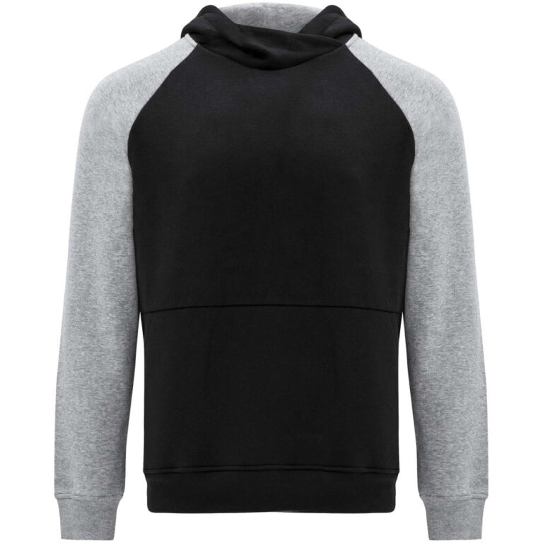 Badet tofarvet børne hættetrøje Tofarvet unisex-hættetrøje. Hætte med krydsende hals og metaløjer. indvendig hætte, snøre og raglanærmer i kontrastfarve. Kængurulomme. Manchetter og kant i 1×1 ribstrik af elastan. Aftagelig etiket.