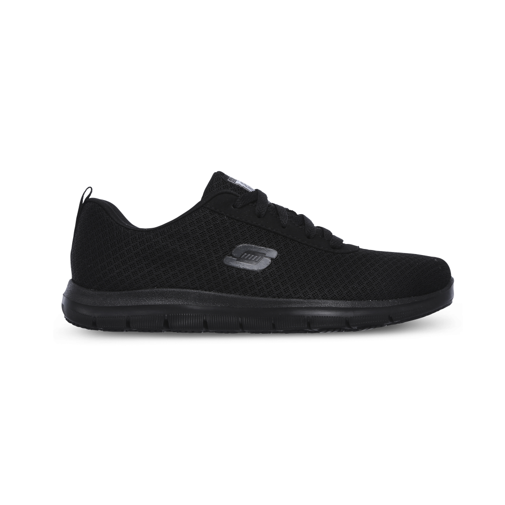 Uno Work shoe Non-slip model from Skechers with Skech-Air which is a visible air cushion. The synthetic upper has embossed details and a mesh lining that provides good comfort. Air Cooled Memory Foam insole. The sh oe is ESD approved and the outsole is oil resistant and non-slip.