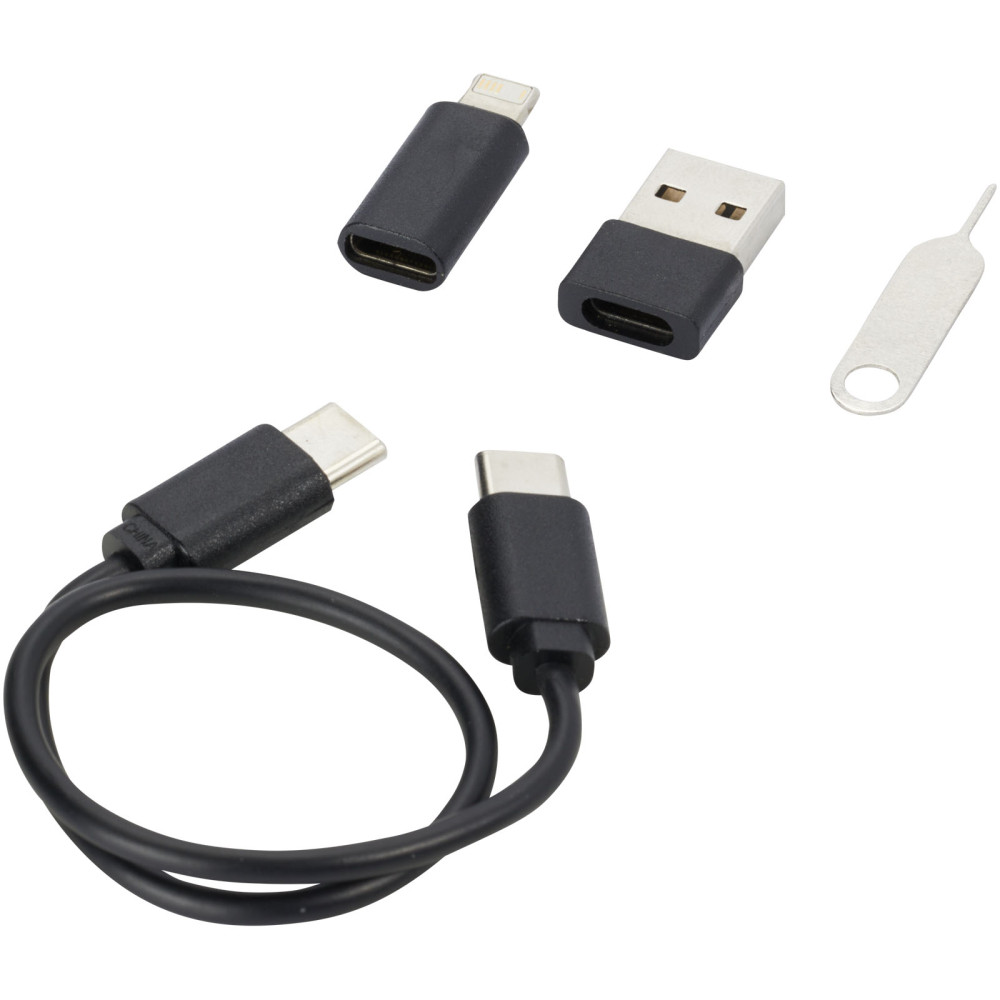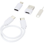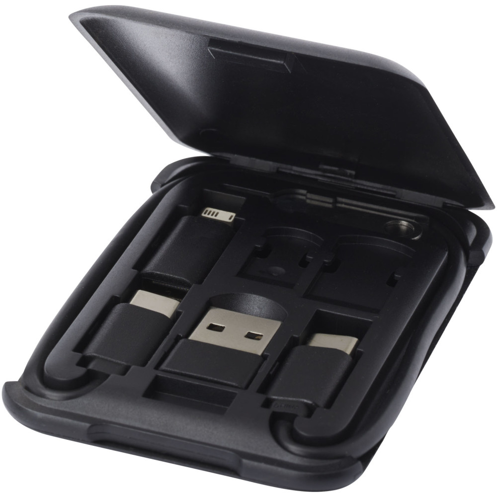 Savvy modulært opladningskabel af genvundet plast med telefonholder Kontakt os for pris Firmalogo kan tilføjes på dette produkt Modulært dataoverførsels- og ladekabel lavet af genvundet plast, leveret i en elegant opbevaringsboks, der også fungerer som telefonholder. Kablet tilbyder flere opladningsløsninger: Type-C og USB-A-indgang og Type-C/iOS/micro USB udgang. Takket være alle disse adaptere og stik giver dette kabel dig mulighed for at oplade de fleste smartphones, kameraer, powerbanks, øretelefoner osv. Kablet har en maksimal udgangseffekt på 2 A. Den har en udskubningsnål, der er praktisk, når du ønsker at tage telefonens SIM kort ud. Opbevaringsboksen har også plads til at opbevare et micro SD hukommelseskort samt et nano SIM kort, hvilket gør dette til det perfekte rejsetilbehør. Kabellængde: 26 cm. Leveres i en kuvert af 100 % genbrugskraftpapir. Farver Hvid Ensfarvet sort Søger du reklameartikler og profiltøj? Kontakt vores team i dag, og lad os hjælpe dig med den rigtige løsning til din virksomhed 70 260 760 Kontakt os 70 260 760 Kontakt os