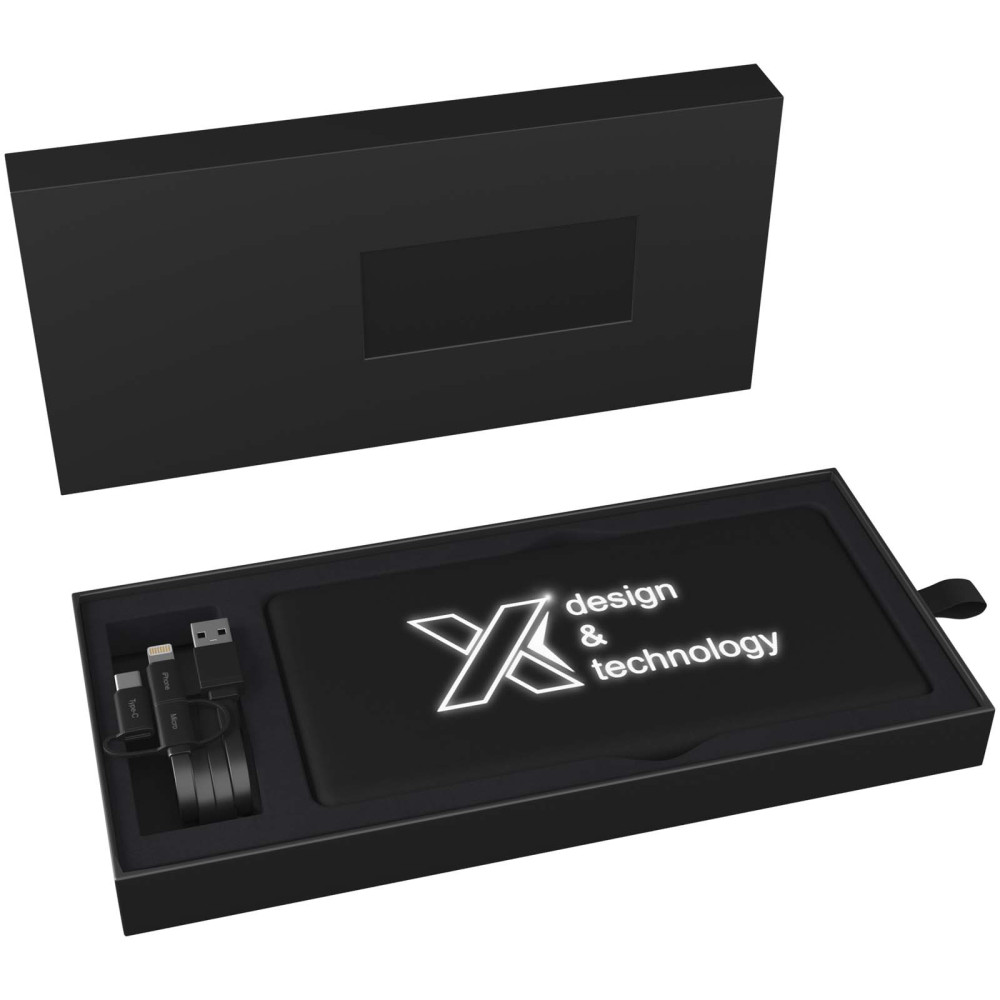 SCX.design P30 8000 mAh solcelledrevet powerbank med lyslogo Kontakt os for pris Firmalogo kan tilføjes på dette produkt 8000 mAh solcelledrevet powerbank med lyslogo og et 3-i-1-kabel i gunvundet PET (Type C, Android, iPhone). Solcelle panelet er lavet af monokrystallinsk. Lyser i 30 sekunder, når den berøres, eller når den genoplades. Kapacitet: 8000 mAh Input: 5 V/1 A USB. Output: 5 V/2 A. Opladningstid for solceller/kunstigt lys: 240 mAh/time (ca. 27 timer for en fuld opladning). Opladning kan også udføres med det medfølgende kabel. Størrelse: 153 × 76 × 13,5 mm. Leveres med en gaveæske fremstillet af genbrugspapir. Farver Ensfarvet sort Søger du reklameartikler og profiltøj? Kontakt vores team i dag, og lad os hjælpe dig med den rigtige løsning til din virksomhed 70 260 760 Kontakt os 70 260 760 Kontakt os