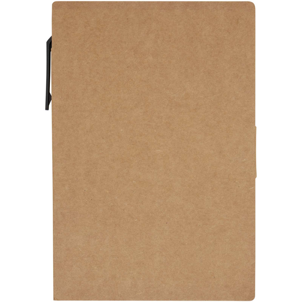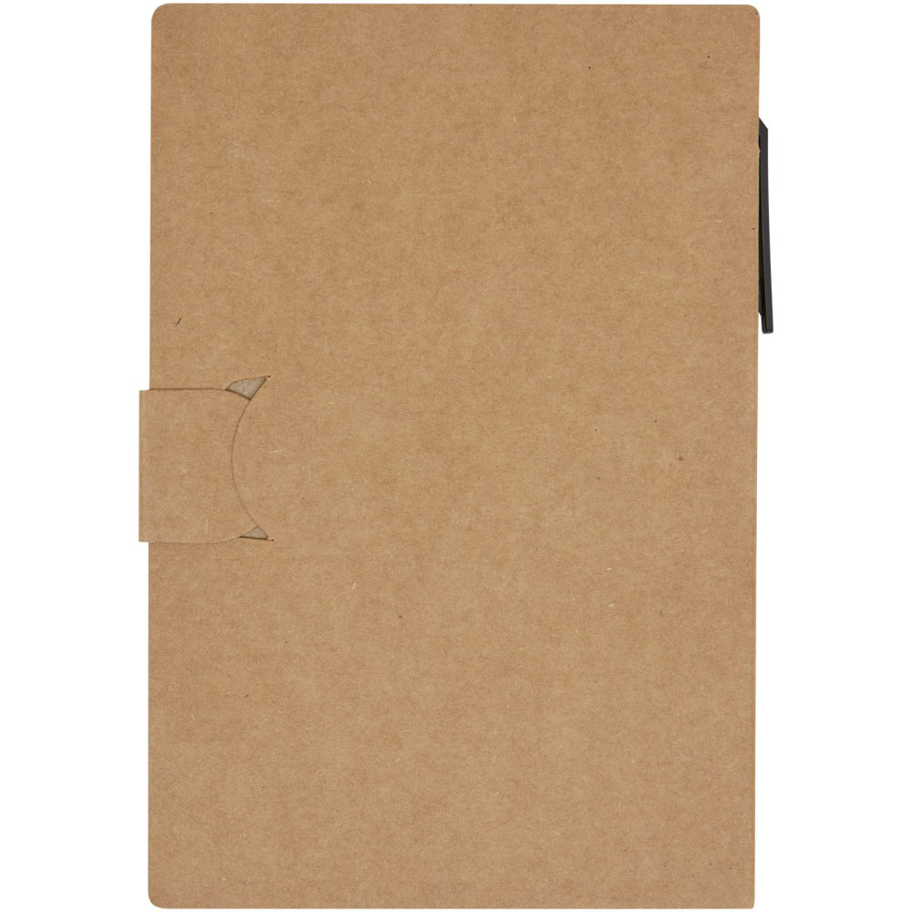 Nomumi A5 dokumentmappe Nomumi dokumentmappe i A5 med runde hjørner er en praktisk kontorartikel fremstillet af genvundet plast. Den har 64 cremefarvede linjerede ark på 80 g/m2, lynlåslukning, løkke til pen og harmonikalomme.