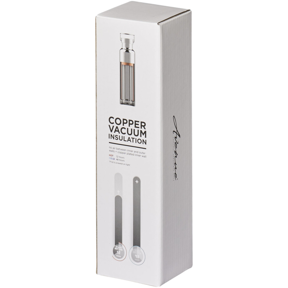 Astra 600 ml RCS certificeret genvundet vakuumisoleret vandflaske af rustfrit stål og kobber (kulsyresikker) RCS certificeret dobbeltvægget vakuumisoleret vandflaske i rustfrit stål og kobber med låg med indbygget karabinhage, der gør den let at fastgøre til en taske eller et bælte. Holder drikkevarer kolde i 48 timer eller varme i 12 timer.Også velegnet til kulsyreholdige drikke. Leveres i en æske af genbrugspap. Kapacitet: 600 ml.